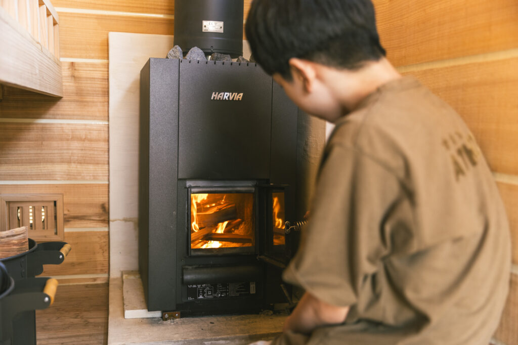 結び薪をサウナストーブにくべる「結びの儀」。薪サウナのやさしい熱と、贈ってくれた人の想いに包まれ、心も体も温まる特別な時間が始まります。